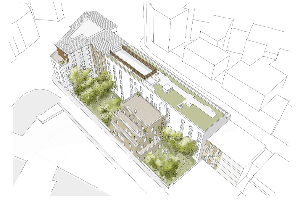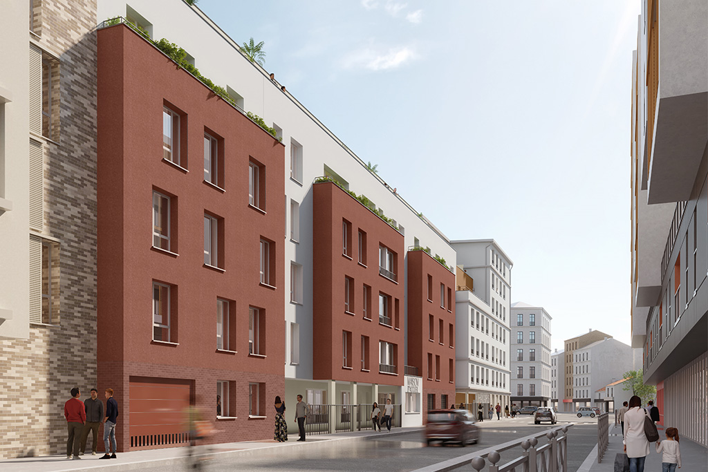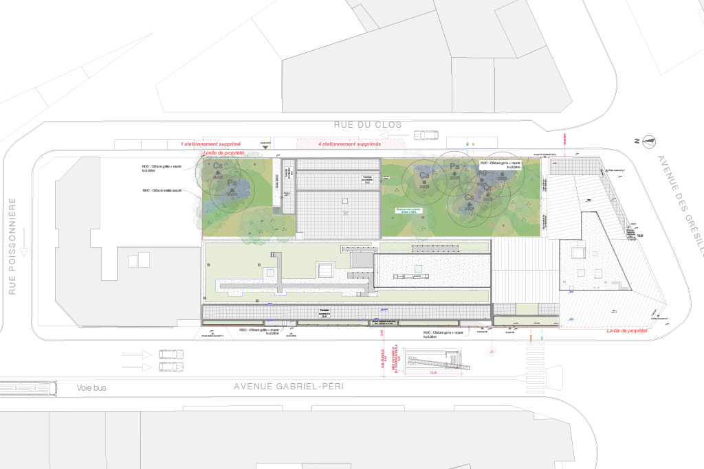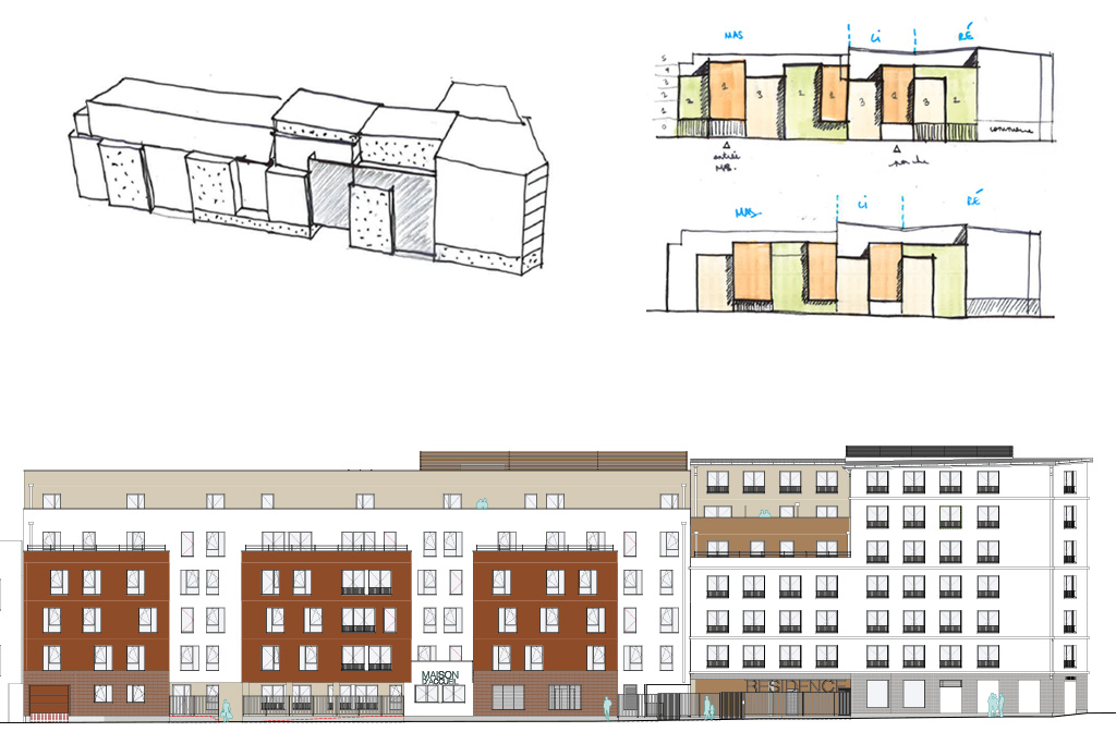 En continuité, la résidence étudiante s’étire le long de l’avenue Gabriel Péri, jusqu’à l’angle avec l’avenue des Grésillons où elle s’élève, affirmant sa présence sur la place : un signal urbain, un repère dans le tissu de la ville. Ses façades adaptent leur langage au contexte, plus animé sur les avenues, plus intime rue du Clos, jouant des hauteurs, des percements, des modulations.