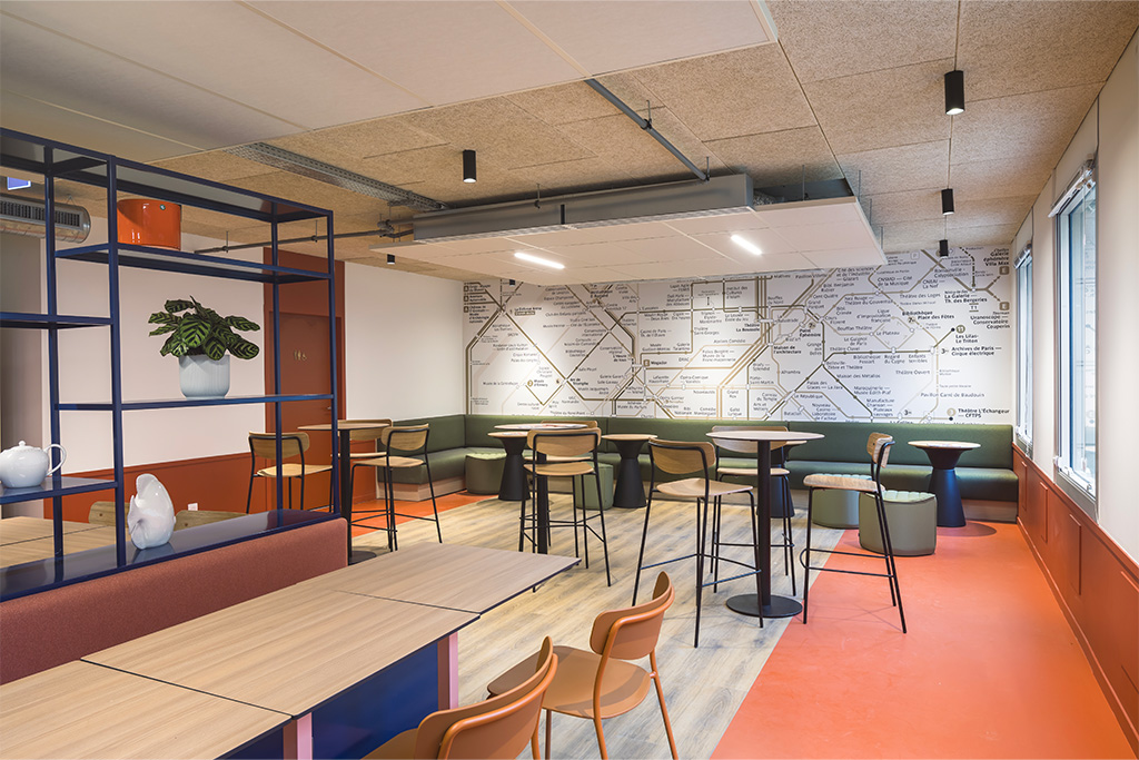 L’héritage de la ville se reflète subtilement dans le choix des couleurs. Les nuances de bleu qui habillent l’accueil évoquent la célèbre manufacture de porcelaines de Sèvres ; dans la cafétéria, la décoration prend un ton léger et ludique en intégrant des éléments qui rappellent l’accessibilité de l’immeuble, comme le vélo suspendu au mur et un Ape Piaggio transformé en tisanerie.