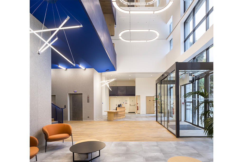 Le hall saisit par son inspiration contemporaine aux allures de lobby d’hôtel. Il devient une introduction spectaculaire à l’univers du bâtiment par l’emploi de matériaux contemporains, aussi neufs que recyclés, dans une démarche de développement durable.
