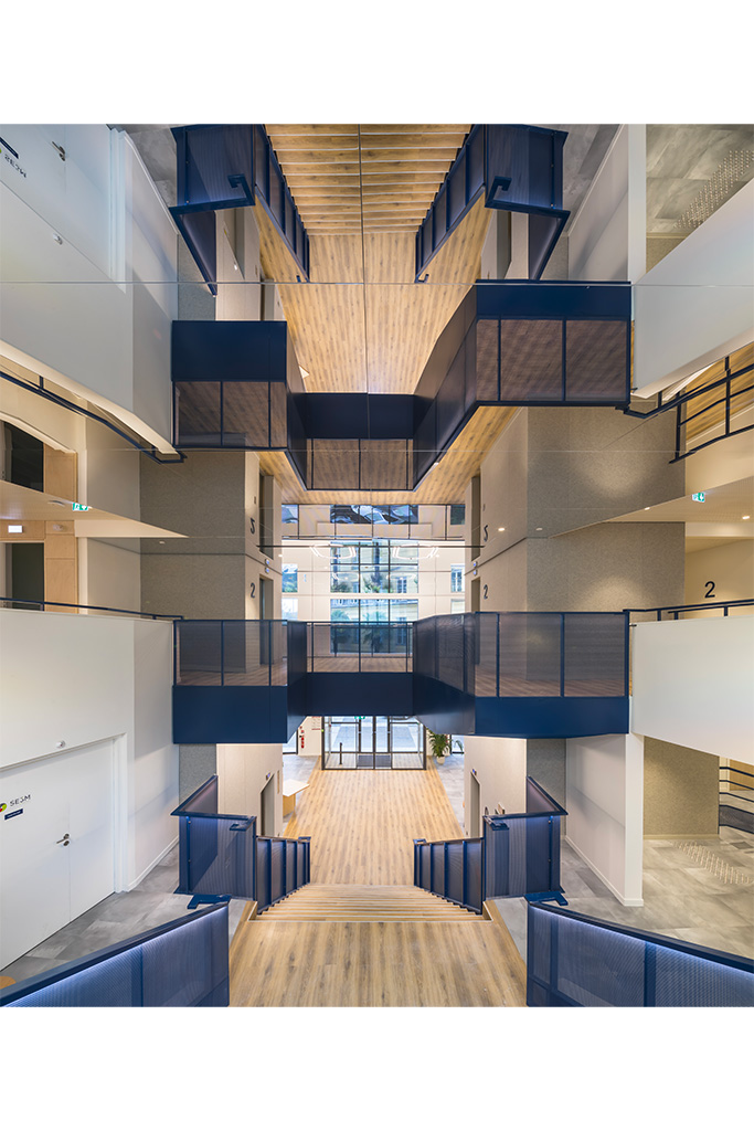 A l’entrée, un escalier monumental, jouant l’effet surprise entre extérieur et intérieur, relie trois niveaux réservés aux espaces partagés : salles de réunion collaboratives et zones de détente.