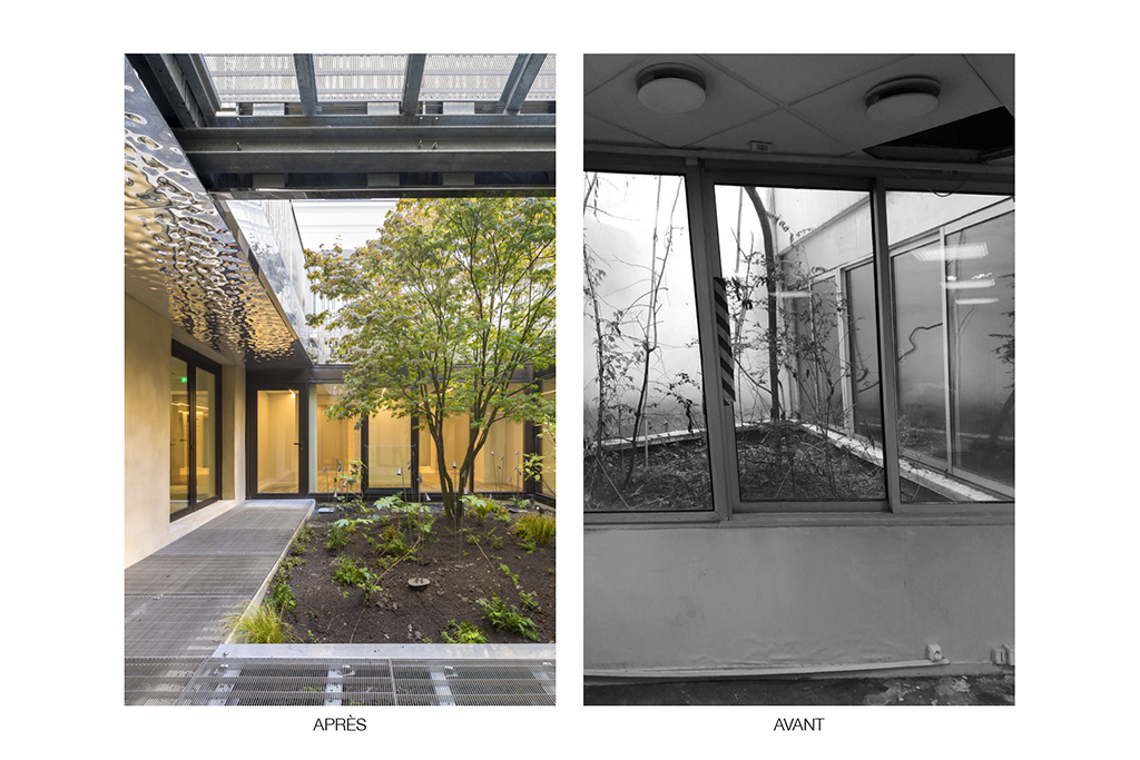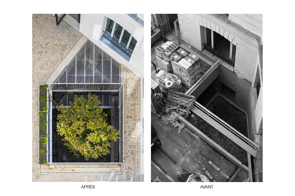 La cour, libérée de l’asphalte, redevient pavée. Des espaces nobles prennent place en rez-de-jardin, valorisés par la création d’un patio en pleine terre, puits de lumière au cœur du bâti. Chaque élément patrimonial retrouve son éclat : les menuiseries extérieures sont restituées à l’identique, les balcons et encorbellements en zinc sont restaurés. Aussi, le bow-window emblématique fait l’objet d’une réhabilitation délicate, conjuguant le charme de l’ancien aux exigences de confort et de performance contemporaines.