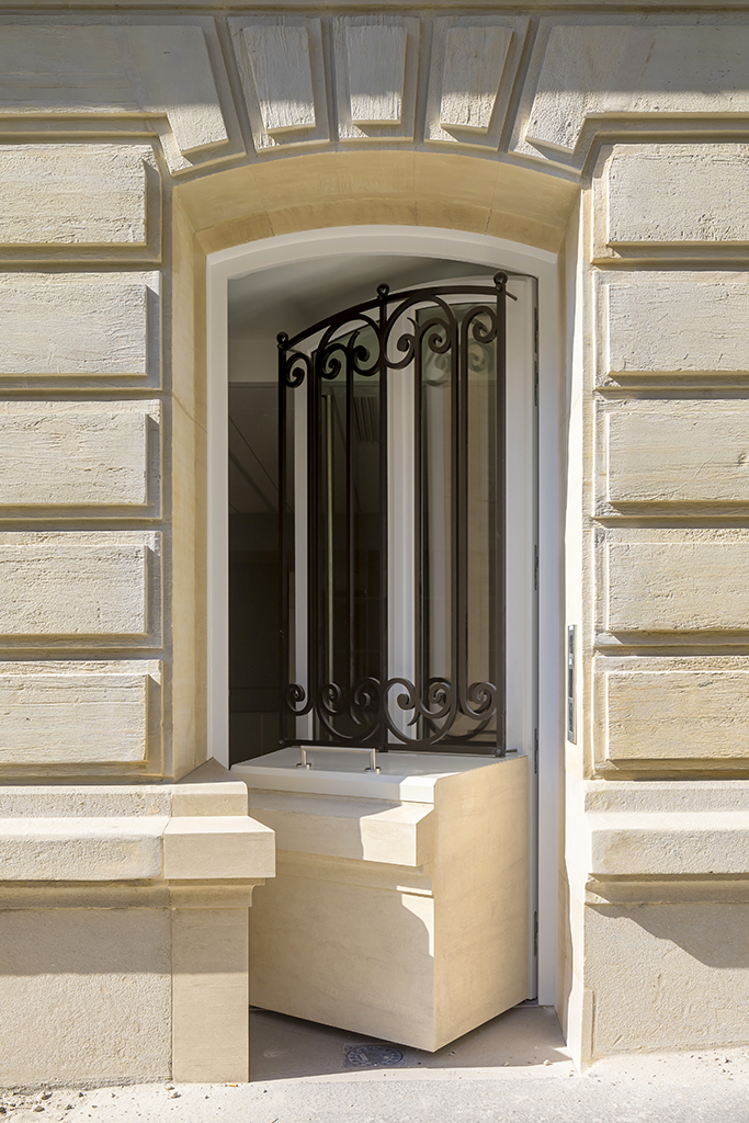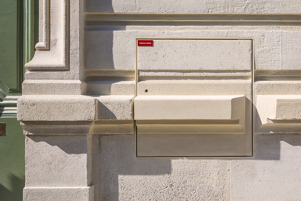 Détails d’intégration technique et d’accessibilité sur la façade en pierre